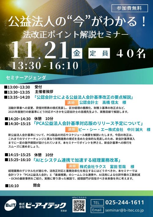お知らせ2025.10.2111/21(金)「公益法人の”今”がわかる!法改正ポイント解説セミナー」開催のお知らせ